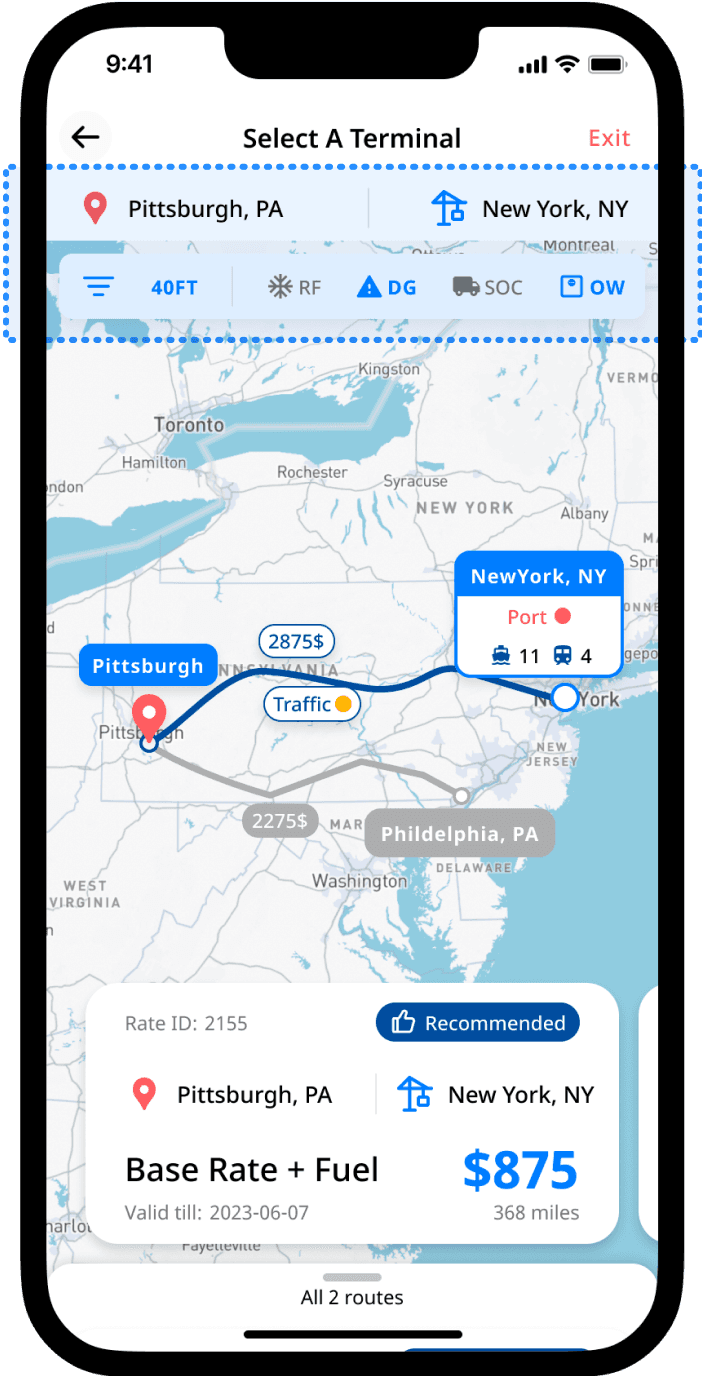 Live map leverages the route comparison with clear indication and card design to assist the terminal selection process.